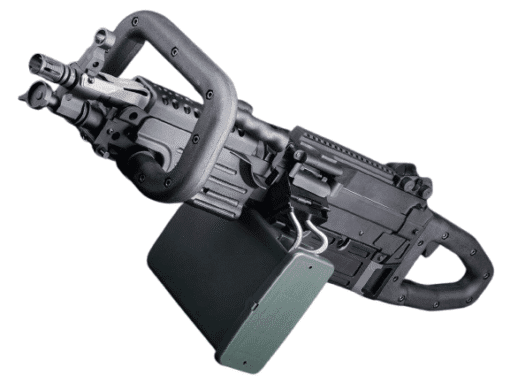 Based on the FN Minimi, the M249 uses a 5.56x45mm NATO cartridge in a belt-fed configuration, supplied from a plastic box magazine. In a pinch, you may also use STANAG compatible M16 magazines in this weapon system. Over the years the M249 has seen quite a few variants, all purpose-tailored to individual’s needs.